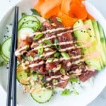 - 腌制15分钟:在组装碗之前,腌制金枪鱼至少15分钟是很重要的。只是不要让它放置超过一个小时.